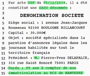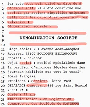 Nos modèles d'annonces légales ont été étudiées afin de les rendre plus simples et afin d'optimiser l'annonce et ce en utilisant les abréviations autorisées par les Greffes, en enlevant les informations inutiles… Nous réduisons la taille de l'annonce légale et donc son prix. Attention, la présentation de l'annonce peut varier sur l'attestation ou lors de la parution effective en fonction des choix et contraintes des journaux.
